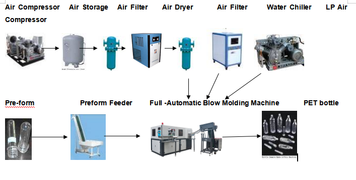 Preformen som er lagret i beholderen transporteres med transportbånd og sorteres halsen oppover for materampen inn til perform-ovnen automatisk. Performene leses nå inn i ovnen utstyrt med infra-lamper.