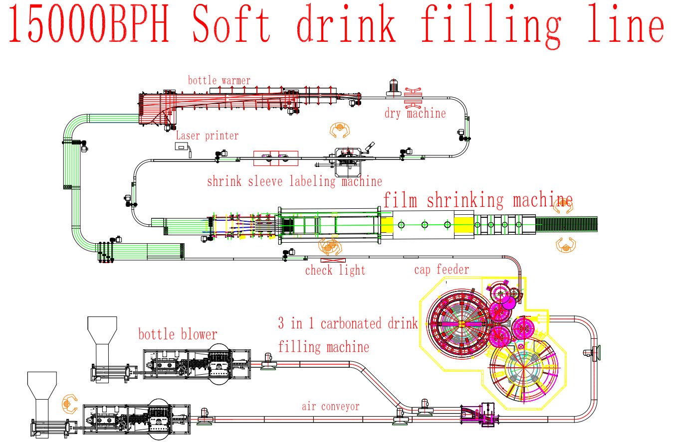 PET Bottle blowing moulding machine, Preform loader, Bottle Unscrambler machine, Automatic 3 in 1 CSD filling machine(Cap loader+ cap on-line sterilizer system ), Bottle warmer, Lamp Check, Bottle dryer, Labeling machine(sleeve shrink labeling machine, hot glue labeling machine, self adhesive labeling machine), Date printer, Automatic packing machine(film, carton), Palletizer machine, Pallet wrapper machine.